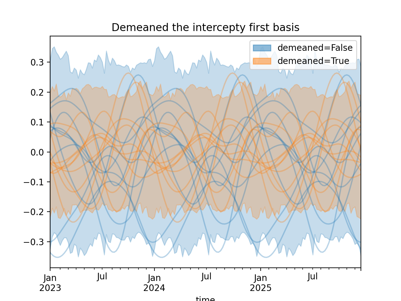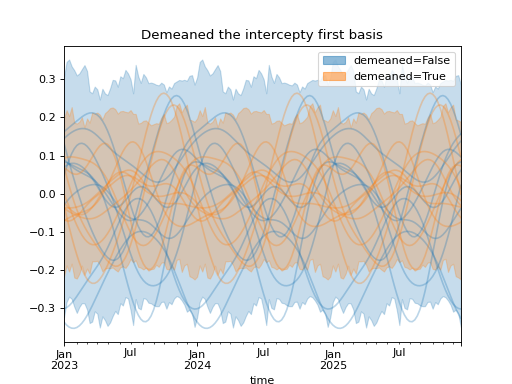 import numpy as np import pandas as pd import xarray as xr import matplotlib.pyplot as plt from pymc_marketing.mmm import HSGPPeriodic from pymc_marketing.plot import plot_curve seed = sum(map(ord, "Periodic GP")) rng = np.random.default_rng(seed) scale = 0.25 ls = 1 kwargs = dict(ls=ls, scale=scale, period=52, cov_func="periodic", dims="time", m=20) n = 52 * 3 dates = pd.date_range("2023-01-01", periods=n, freq="W-MON") X = np.arange(n) coords = {"time": dates} hsgp = HSGPPeriodic(demeaned_basis=False, **kwargs).register_data(X) hsgp_demeaned = HSGPPeriodic(demeaned_basis=True, **kwargs).register_data(X) def sample_curve(hsgp): return hsgp.sample_prior(coords=coords, random_seed=rng)["f"] non_demeaned = sample_curve(hsgp).rename("False") demeaned = sample_curve(hsgp_demeaned).rename("True") combined = xr.merge([non_demeaned, demeaned]).to_array("demeaned") _, axes = combined.pipe(plot_curve, "time", same_axes=True) axes[0].set(title="Demeaned the intercepty first basis") plt.show()