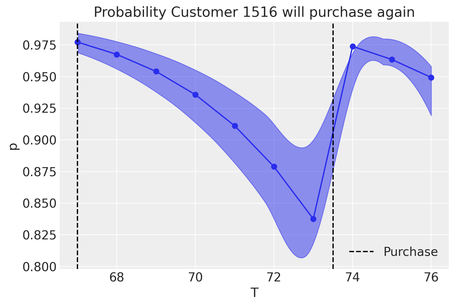 From the plot above, say that customer 1516 makes a purchase at week 73.5, just over 6 weeks after they have made their last recorded purchase. We can see that the probability of the customer returning quickly goes back up!