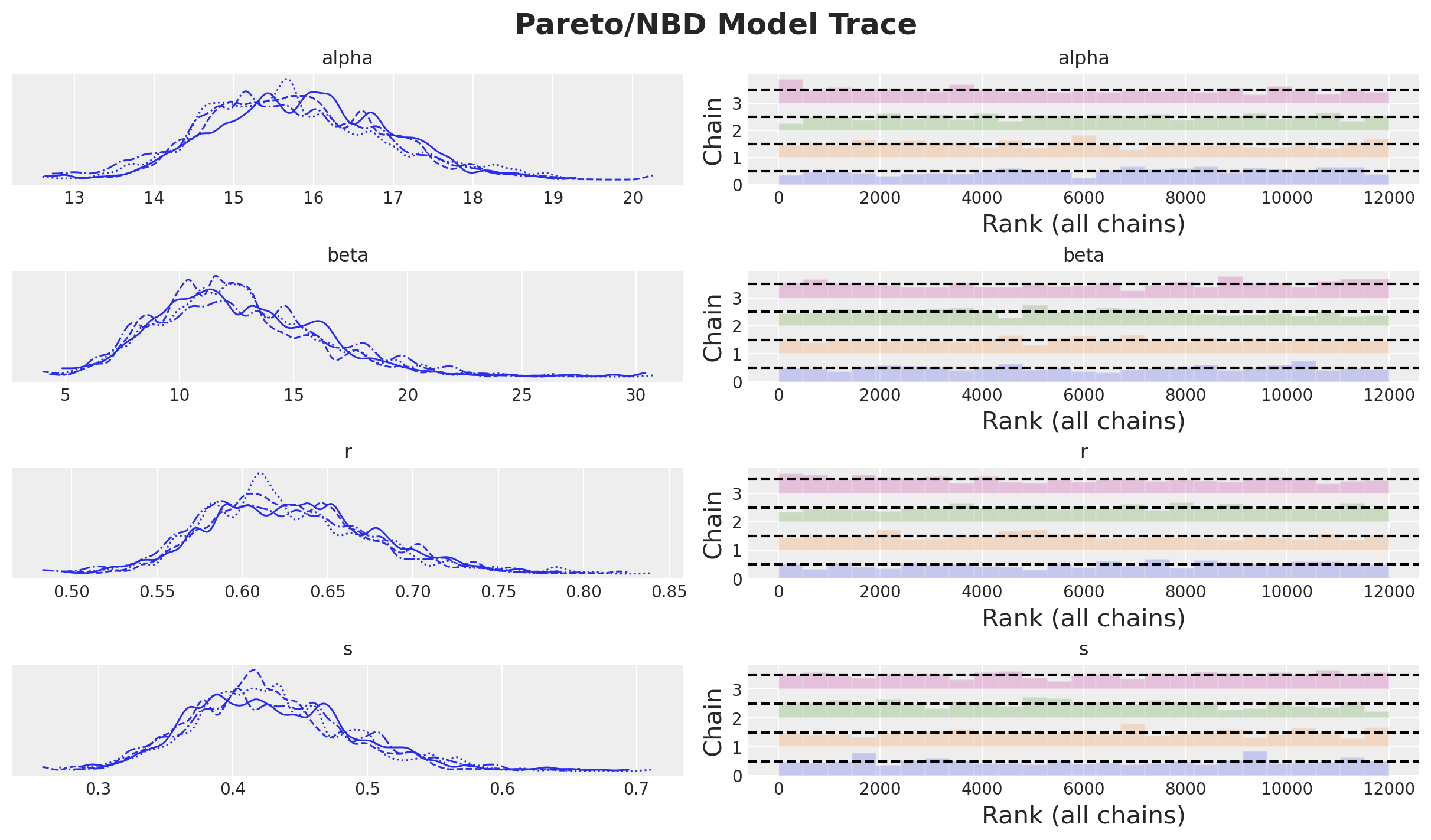 In this notebook we will use Bayesian inference to fit a Pareto/NBD model in PyMC-Marketing, and compare results with the frequentist lifetimes library (no longer maintained). We will also demonstrate the predictive functionality of this model, along with an example for time-invariant covariates.