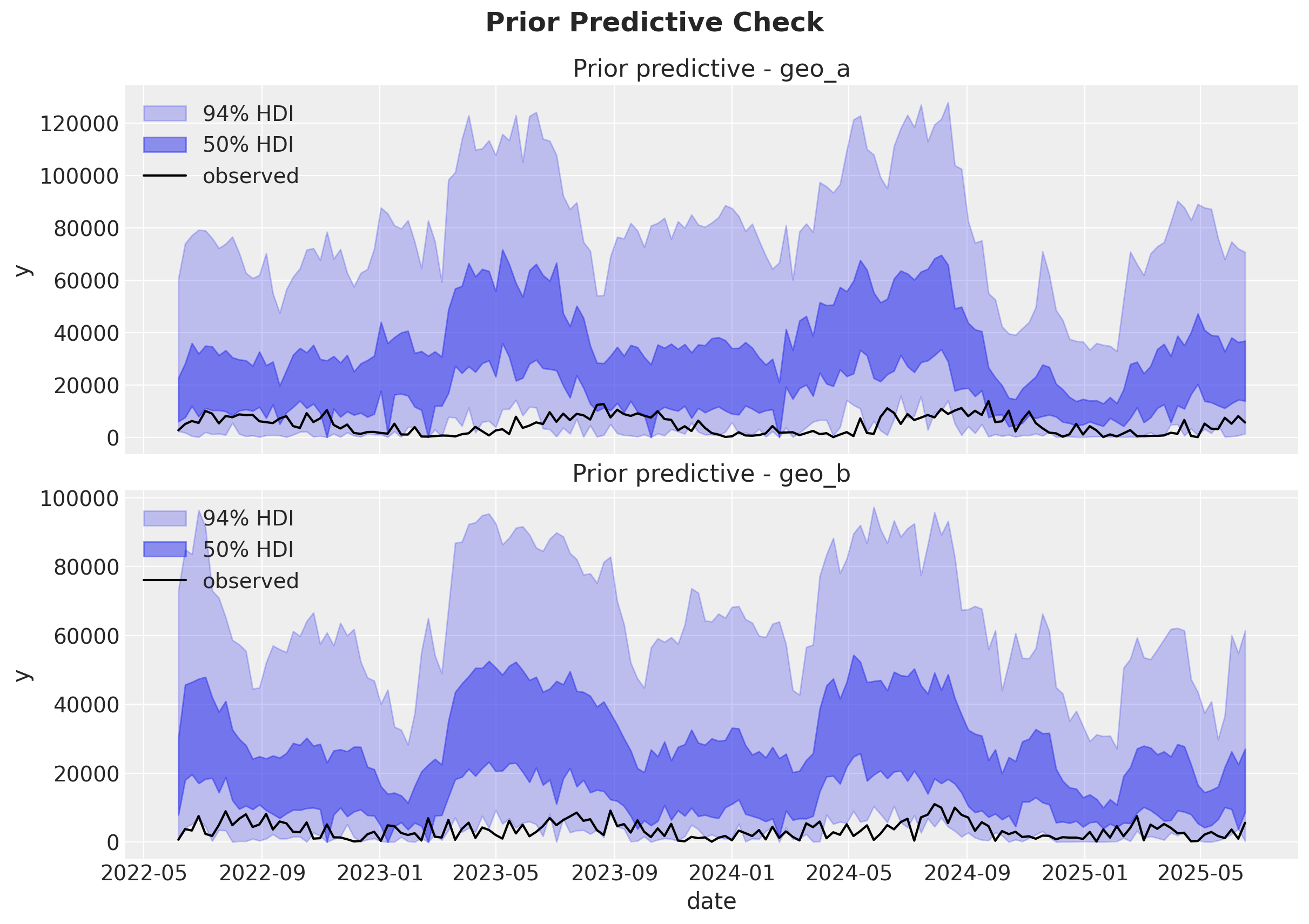Why this custom model? The MMM class in PyMC-Marketing is very flexible. You can use it to build models with different structures. For example, you can use it to build a model with hierarchical structures and global time-varying intercepts and media multipliers. Nevertheless, in many cases teams and organizations want to have more control over the model specification. Hence, using PyMC with PyMC-Marketing allows you to implement any type of model you want.
