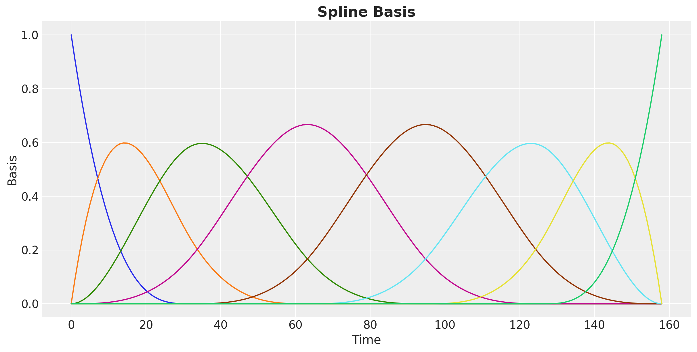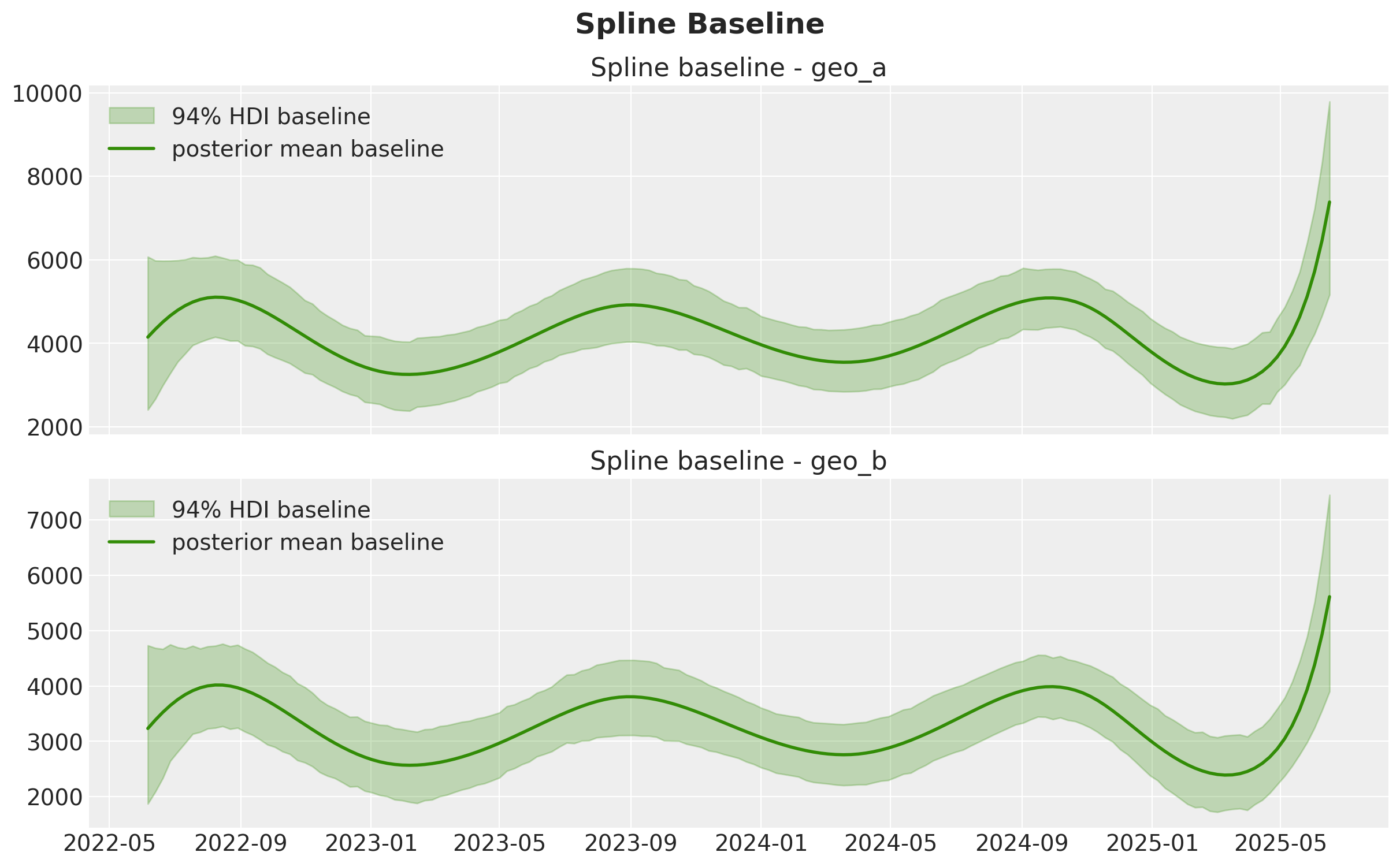 Instead of a static intercept, we let baseline demand vary smoothly over time with cubic B-splines (see the PyMC example notebook on Splines).