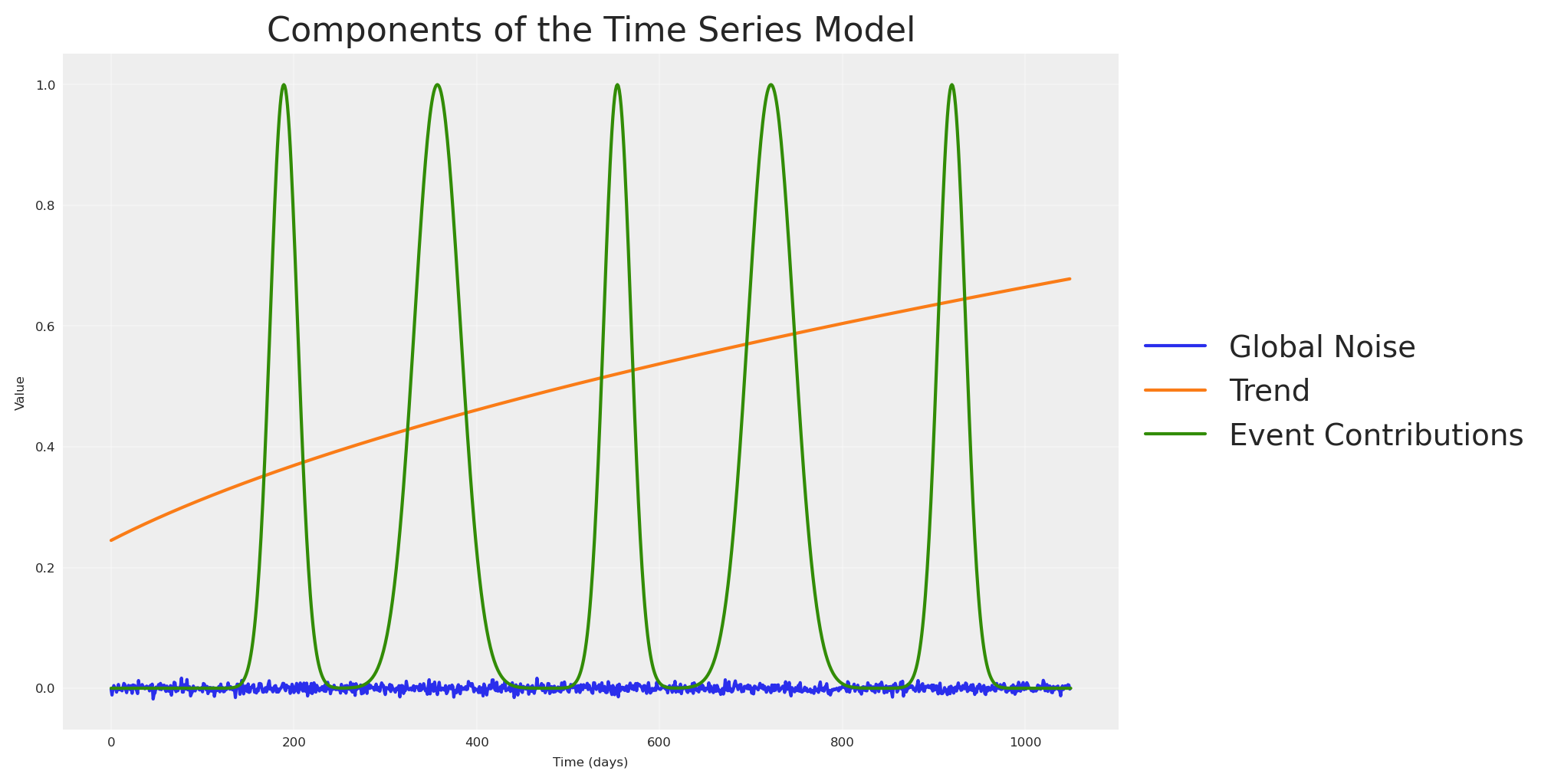 Based on the previous DAG, we’ll simulate data in pytensor. We make the relationships additive at each node and allow nonlinear response only in the final mapping from lower-funnel exposure to outcome. Time is indexed by \(t=1,\dots,T\).