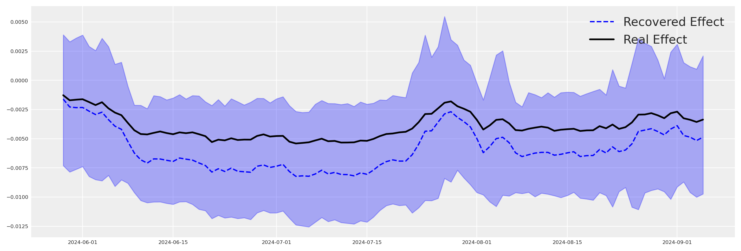 This is great, we can see that the recovered effect is very close to the true effect in the in-sample period. We can do the same for the out-of-sample period, and using the out of sample period, we observe the causal effect of \(X1\) on \(Y\) was properly recovered.